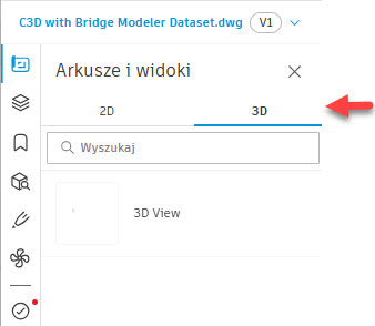 Po lewej stronie na pasku nawigacji, w Arkusze i widoki przechodzimy do trybu przeglądu 3D. Kliknięcie w 3D View otwiera widok modelu.
