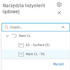 Panel po lewej stronie Narzędzia inżynierii lądowej na samej górze zawiera listę linii trasowania i profili projektu. Wskazywanie ich na liście podświetla obiekt w modelu, co bardzo ułatwia poprawny wybór.
