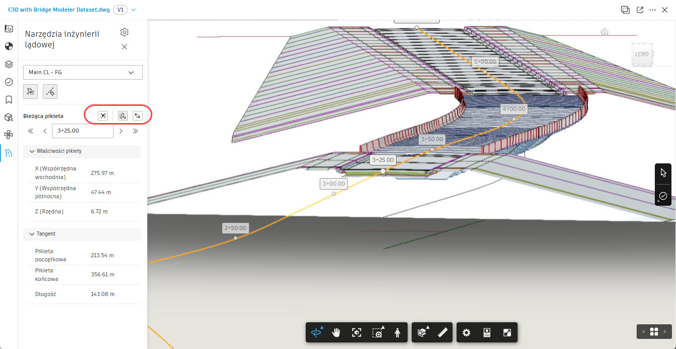 Dostęp do dedykowanych narzędzi przeglądu modelu uzyskamy po wybraniu z lewej belki ikony Narzędzia programu Civil.