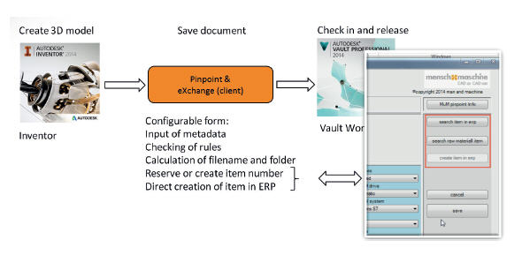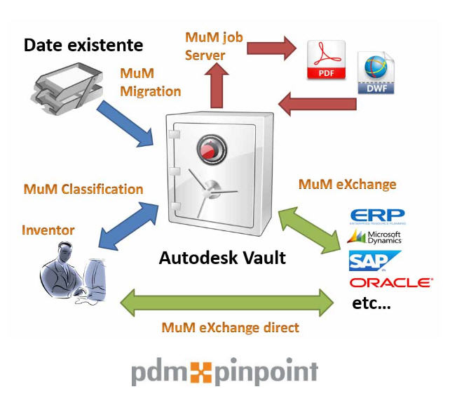MuM PDM Pinpoint to pakiet oprogramowania, dostępny wyłącznie w Man and Machine, zawierający zestaw narzędzi do klasyfikacji, automatyzacji, integracji i migracji danych produktów. MuM Pinpoint oferuje rozwiązania PDM, które są ściśle zintegrowane z Autodesk Inventor, systemy ERP do Autodesk Vault i szybką pomoc w stworzeniu i migracji danych do środowiska programu Autodesk Vault. Moduły eXchange i job Server automatyzują zadania i zapewniają dwukierunkową łączność między podobnymi systemami ERP, takimi jak SAP i Oracle.